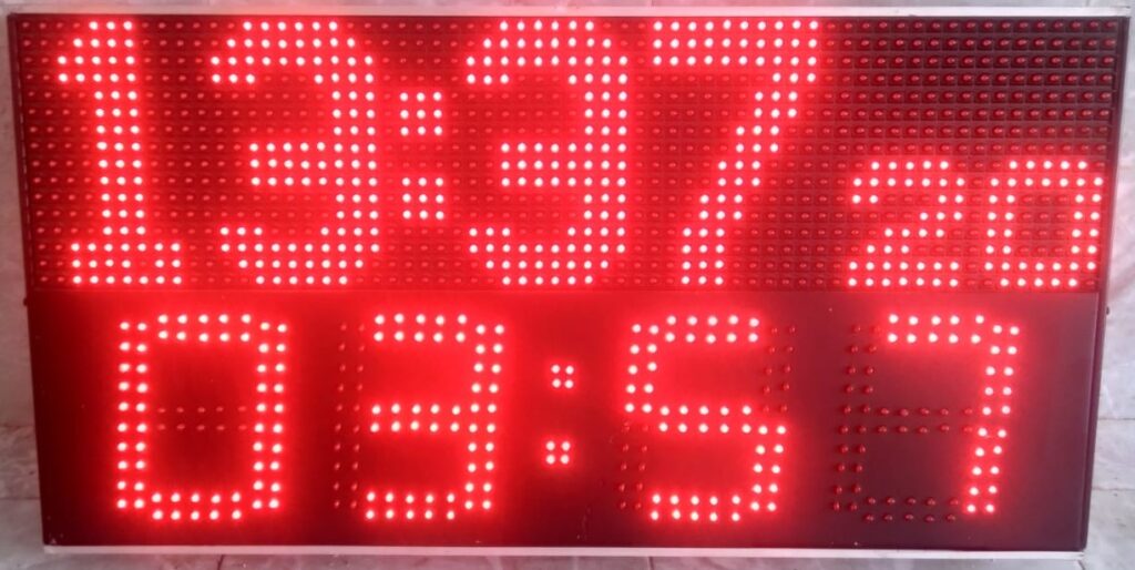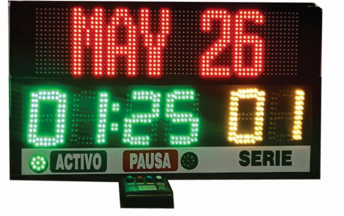 Cronómetro y reloj hora-fecha para gimnasio para hacer series cada determinado tiempo, control inalámbrico, indica estado de pausa – actividad y sistema sonoro de preaviso para cada cambio de serie